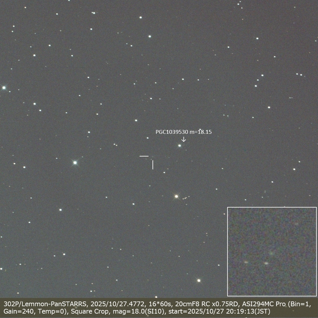 302P/Lemmon-PanSTARRS, 2025/10/27.4772, 16*60s, 20cmF8 RC x0.75RD, ASI294MC Pro (Bin=1, Gain=240, Temp=0), Square Crop, mag=18.0(SI10)