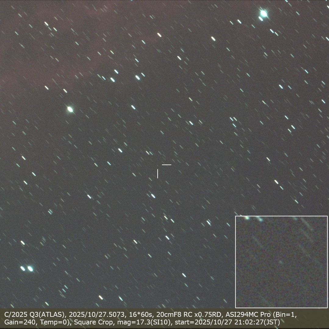 C/2025 Q3(ATLAS), 2025/10/27.5073, 16*60s, 20cmF8 RC x0.75RD, ASI294MC Pro (Bin=1, Gain=240, Temp=0), Square Crop, mag=17.3(SI10)