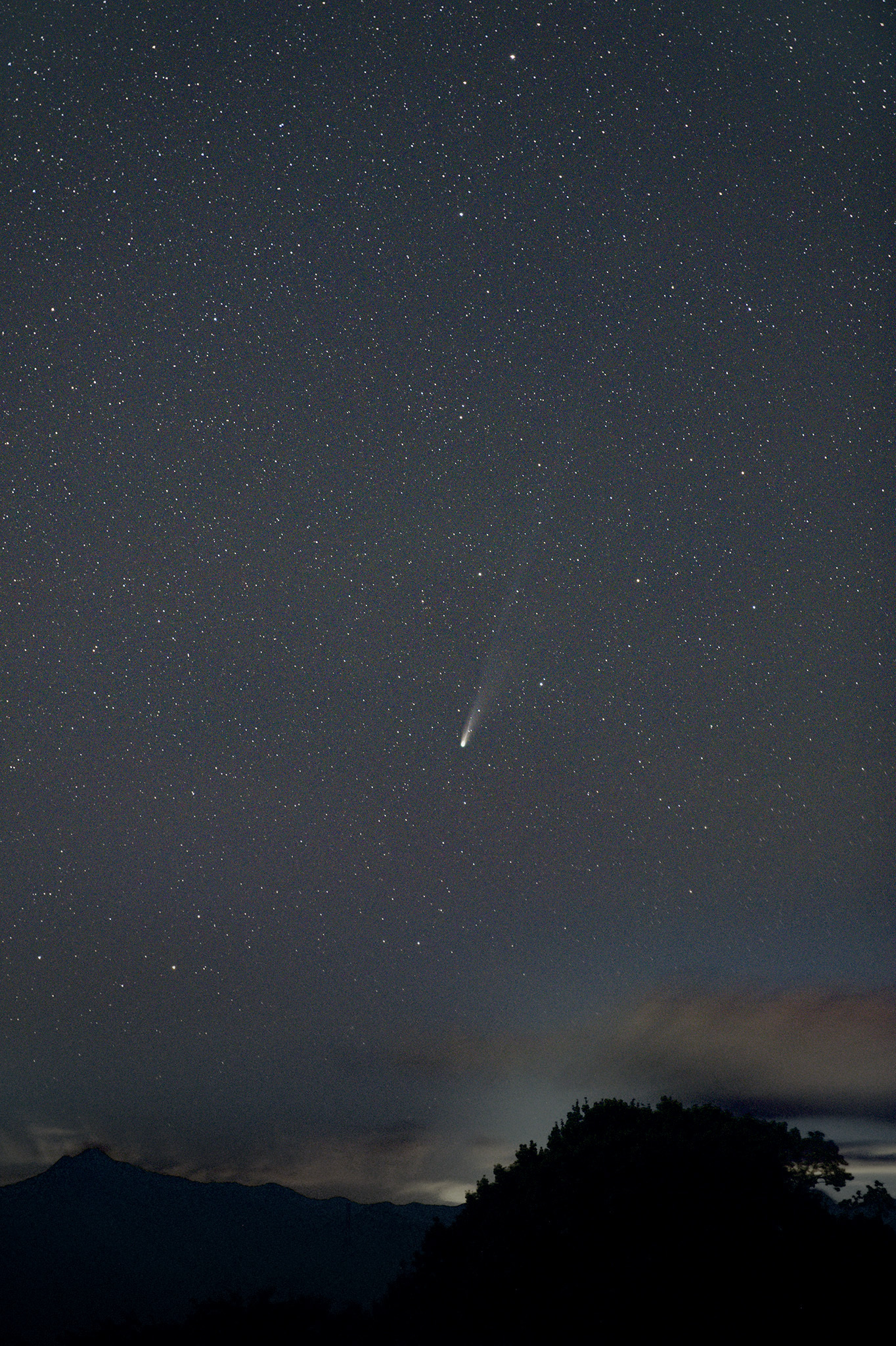 肉眼で確認でき50mm双眼鏡では尾が伸びている様子がわかりました。この日は空が暗くなるにつれて晴れ間が広がり撮影できました。