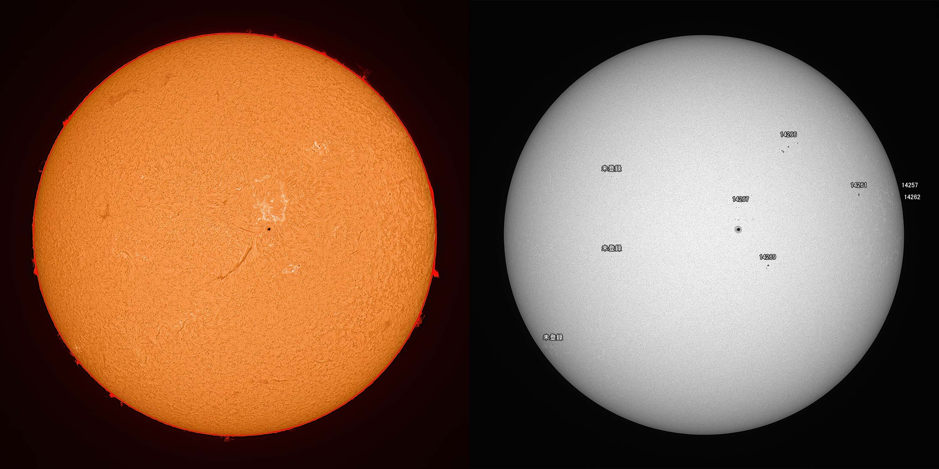 光球面:FireCapture、ROI 3600x2400、Gain 100、2.6msec x1000、撮影時間 31秒/プロミネンス:FireCapture、ROI 3600x2400、Gain 300、2.6msec x1000、撮影時間 31秒