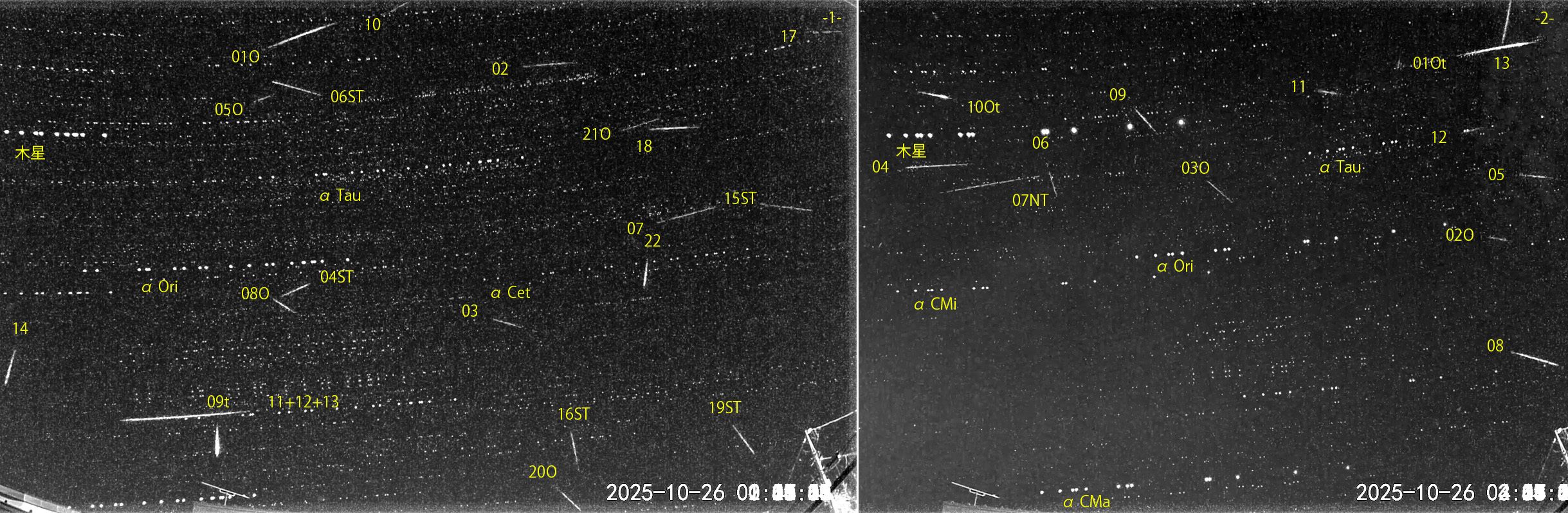 1) 00:31から約2時間の22コマを、2) 02:43から約2時間の13コマを処理しました。 出現した順に数字と記号を始点付近に記入。tは痕traceあり。O:オリオン座流星群、ST:おうし座南流星群、NT:おうし座北流星群