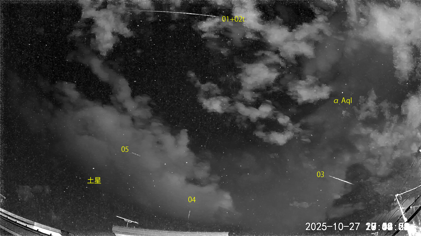 17:09から約3時間の5コマを処理しました。雲の多い宵でした。 出現した順に数字と記号を始点付近に記入。tは痕traceあり。