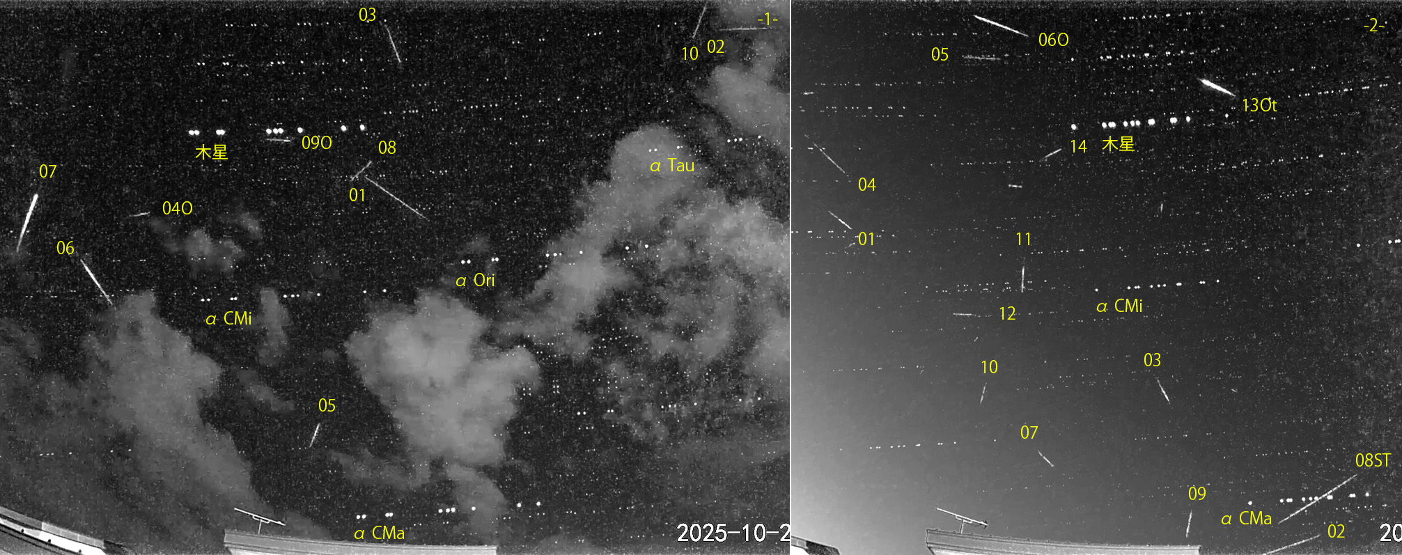 1) 02:46から約1.5時間の10コマを、2) 04:02から約1時間の14コマを処理しました。02時頃から晴れてきました。 出現した順に数字と記号を始点付近に記入。tは痕traceあり。O:オリオン座流星群、ST:おうし座南流星群、NT:おうし座北流星群 オリオン座群の活動も低調になりました。