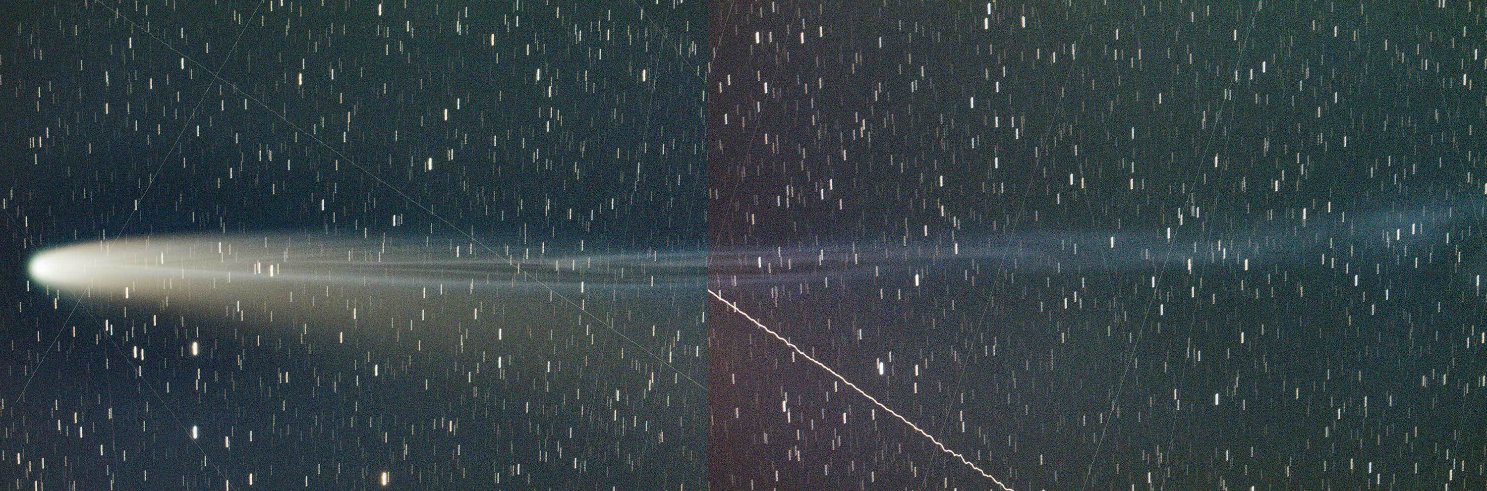 阿蘇二重の峠先で撮影しました。120s7枚から強調した2枚をつないでいます。コマから出た数本のイオンテイルが巻き付きながらたなびいていく様子が分かります。