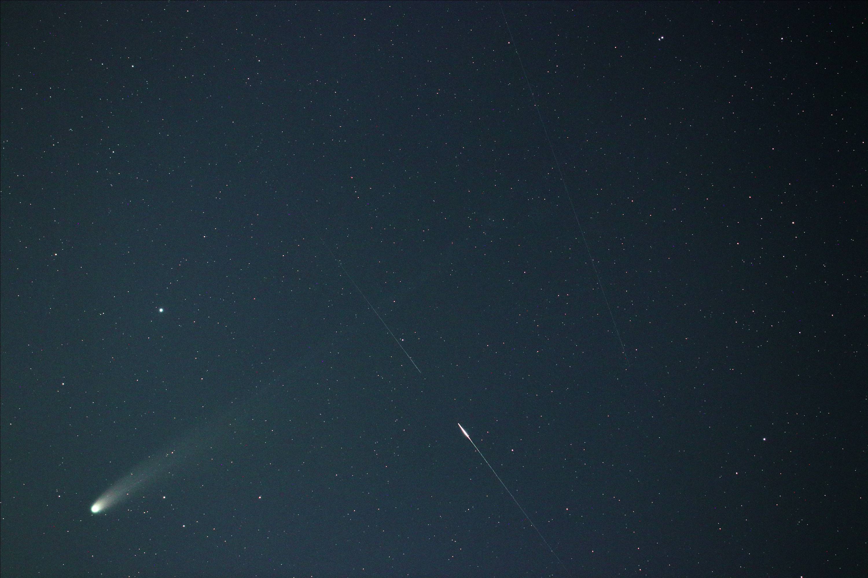レモン彗星の画像を確認していると流星が?と、ひとつ前の画面を見ると延長に光跡が確認されたので衛星フレアでした。