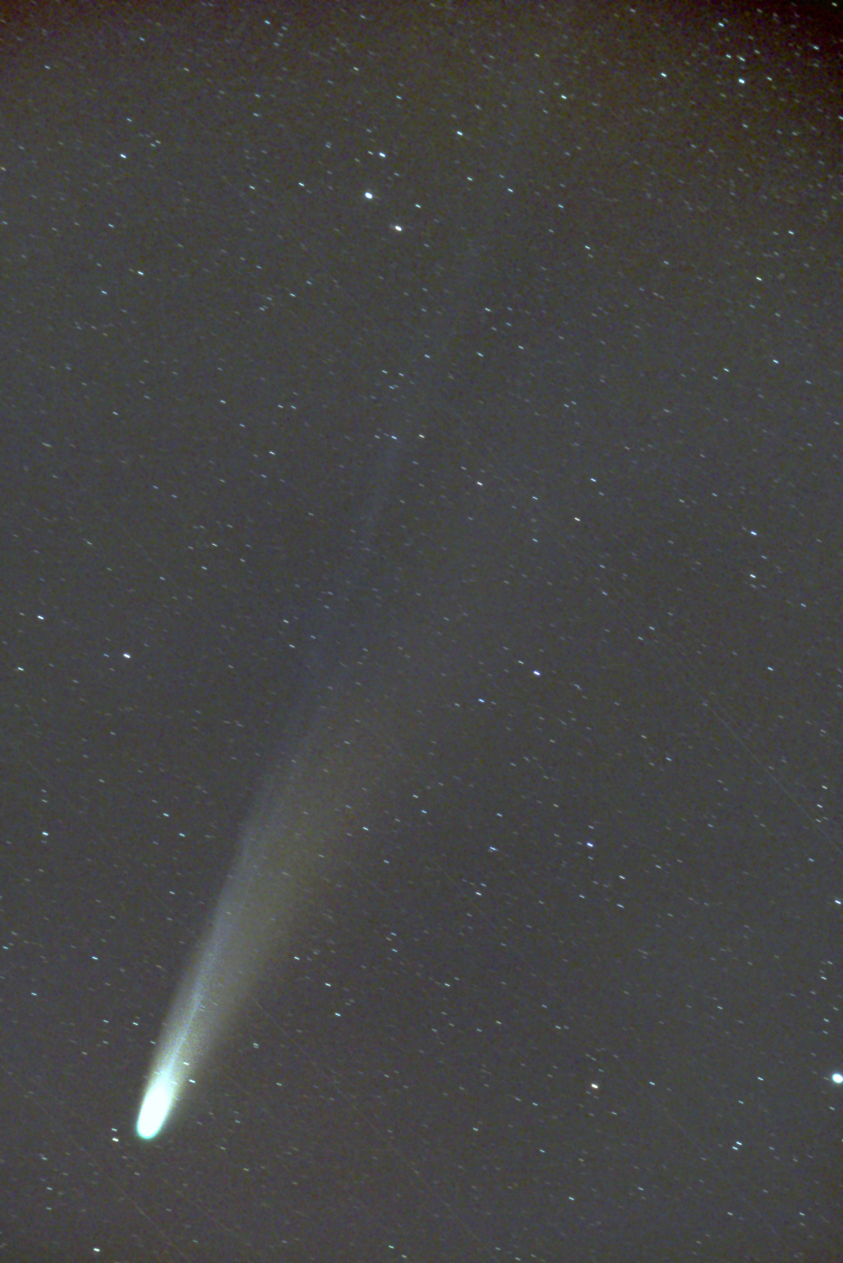 タイミング良く西天が晴れ急いで準備しました。満月前の明るい夜空でもなんとかイオンテールが写りました。