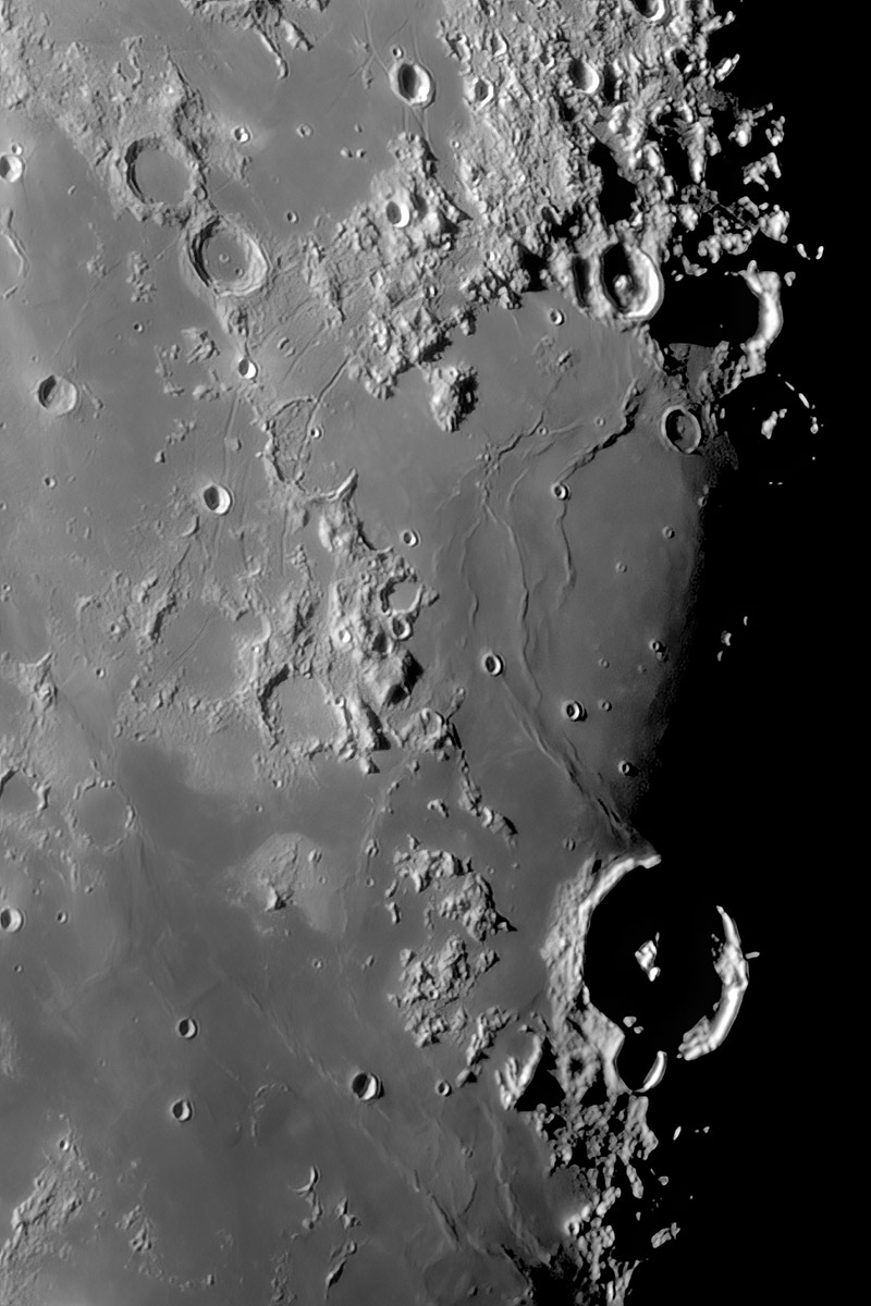 湿りの海周辺は特徴のある谷やリンクルリッジが多く、眼視でも楽しい一帯です。撮って出しのser動画ファイルでは、月面が気流で激しく揺れていました。