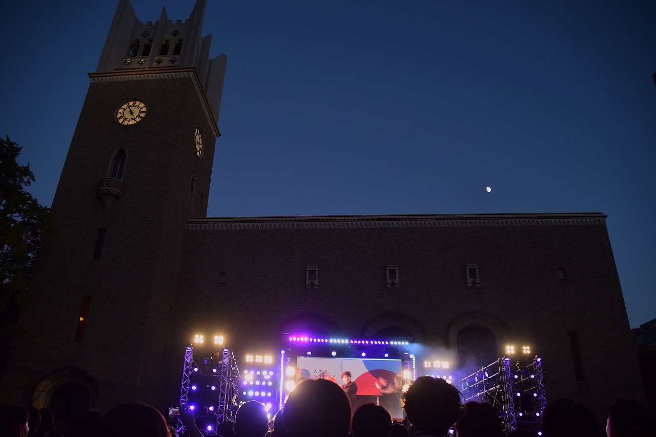 早稲田祭で賑わう大隈講堂前のステージと歴史を感じさせる大隈講堂の上に月が昇ってきました。