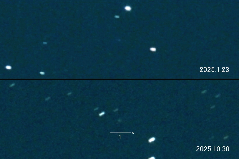 2025.1.23 → 16等級後半 2025.10.30 → 16等級前半 2025年8月5日が近日点でした。 地球との位置関係により2026年春が明るさのピークで 15等級という予想です。