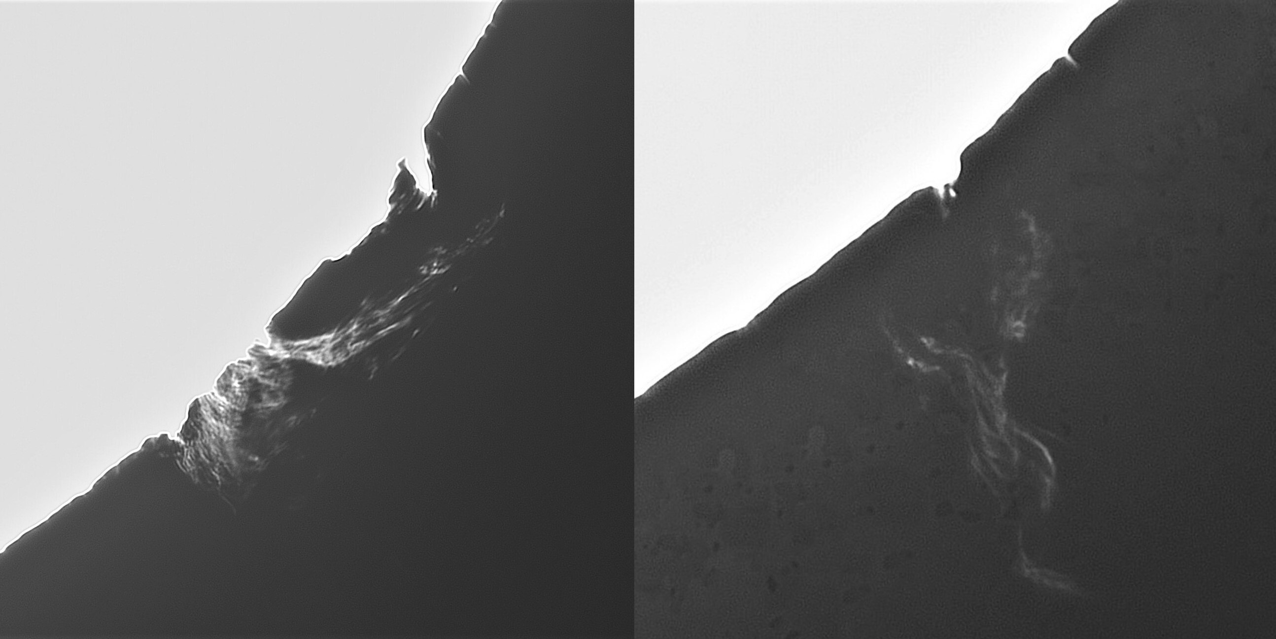 10:04.13:43(画面サイズは左右異なります。) このプロミネンスは15時から17時にかけてゆっくり膨張し、一方の端に吸収されるように消えていきました。 正しくは、「噴出」するにはエネルギー不足ということでしょうか。