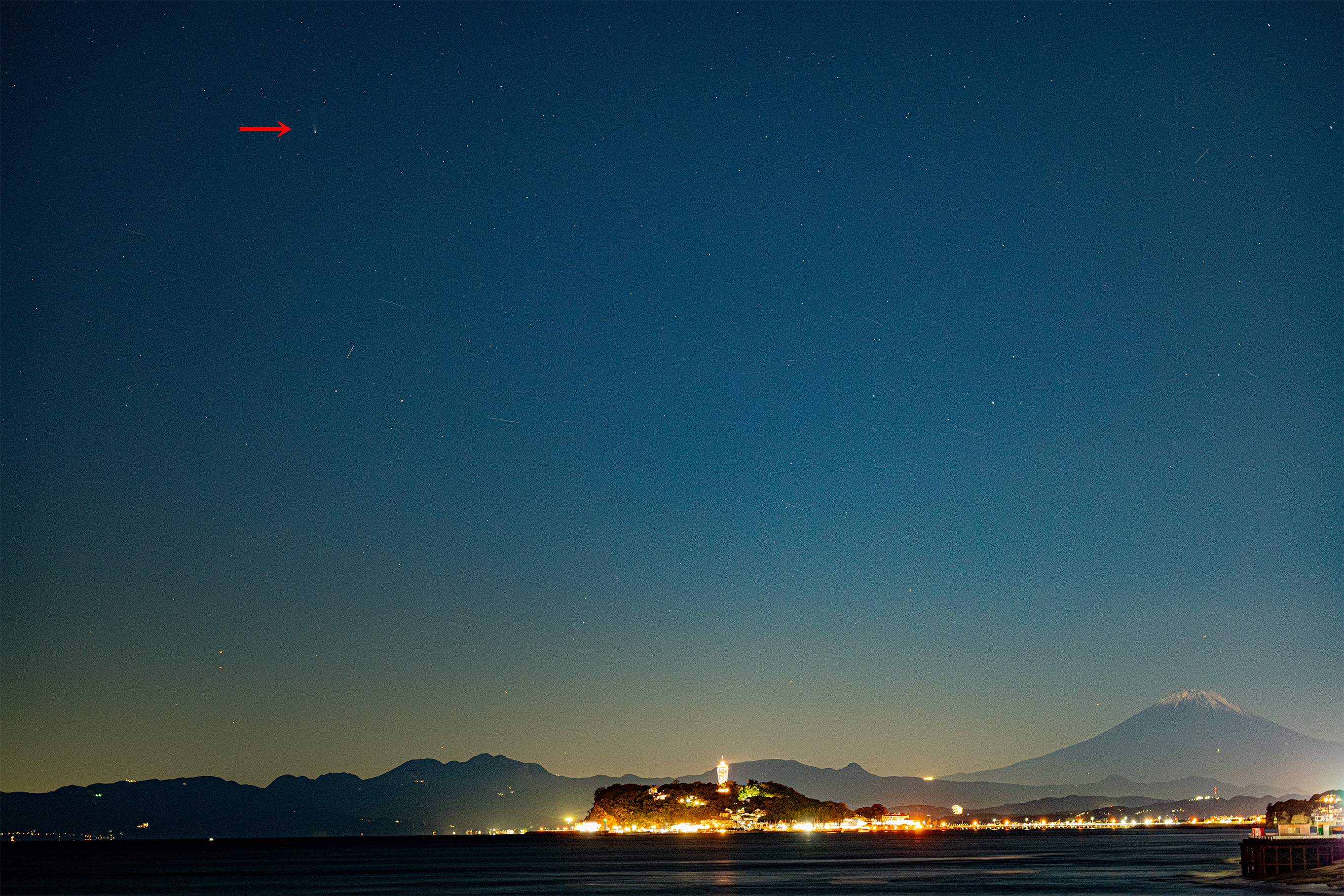 初冠雪の浅間山とレモン彗星