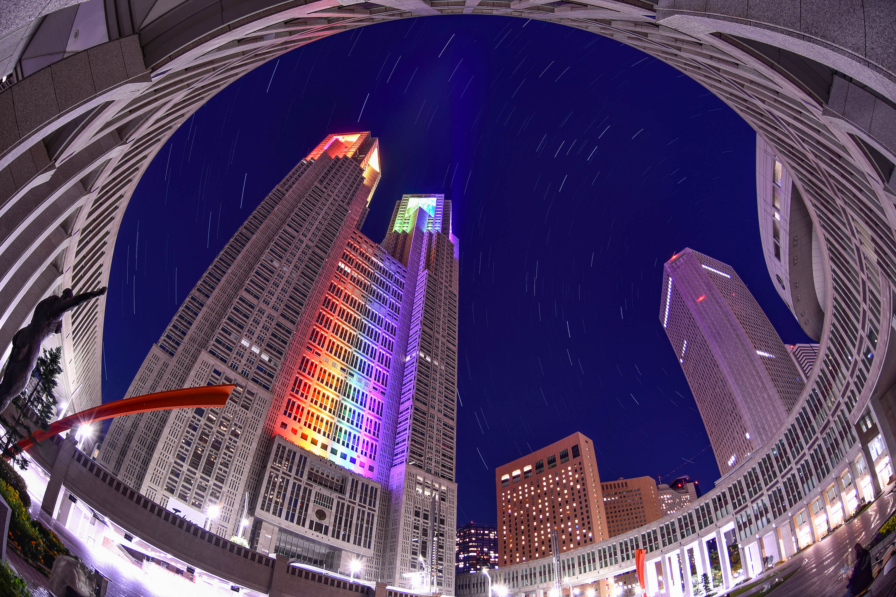 佐藤 純哉東京都庁レインボーライトアップと星空 魚眼レンズ使用