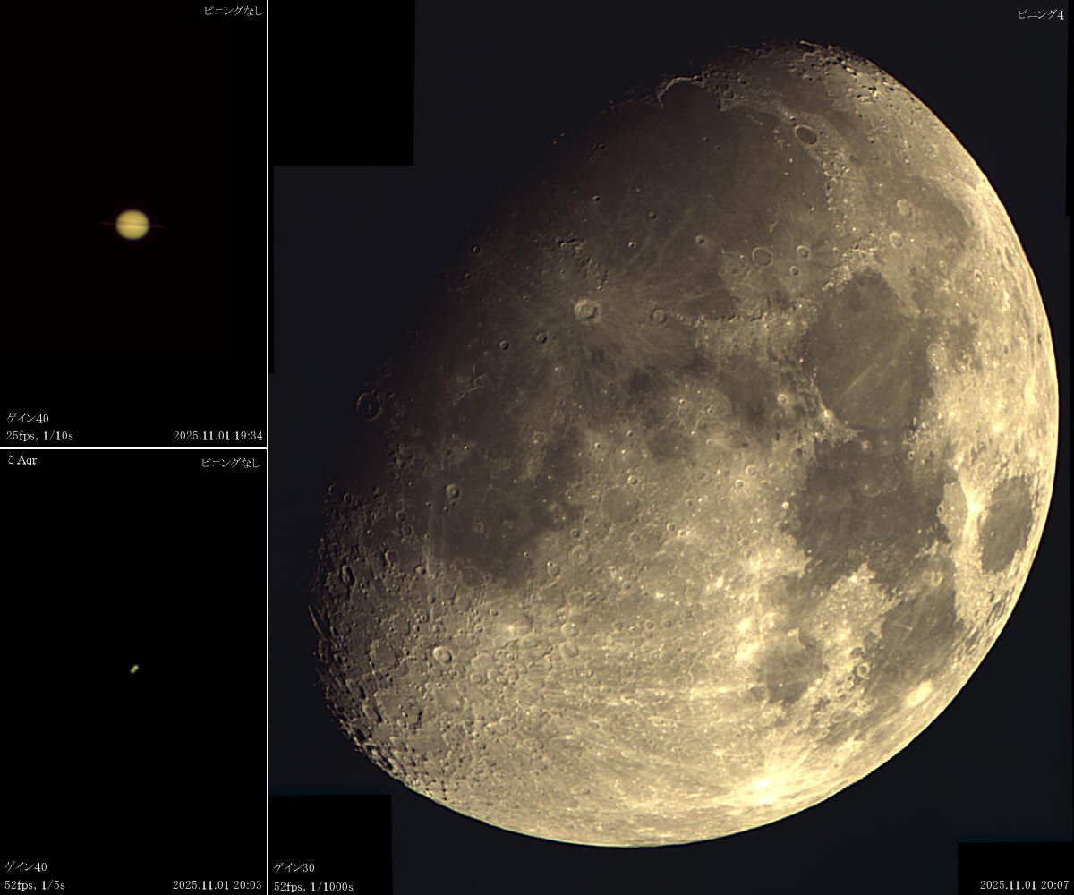 月の全景はビニング4で撮影した動画を7ヶ所で切り出してスタック処理後にモザイク合成をしたもので150フレーム程度を使用しています。土星とみずがめ座ζは画像に示した条件で撮影した動画からスタック処理に1111枚、201枚を使ったので、露出に換算するとそれぞれ44.4秒、3.86秒となります。