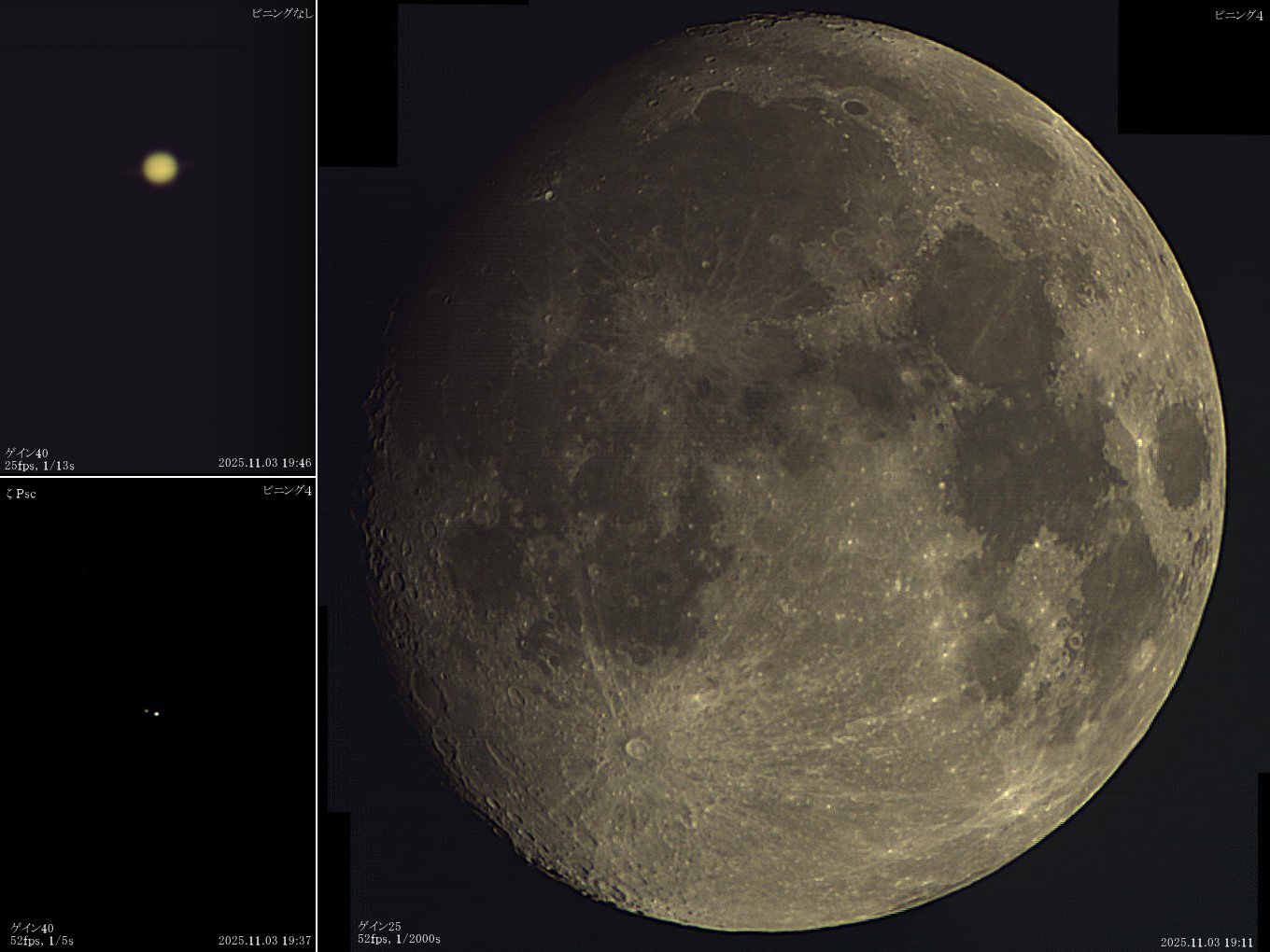 月の全景はビニング4で撮影した動画を8ヶ所で切り出してスタック処理後にモザイク合成をしたもので150フレーム程度を使用しています。土星とうお座ζは画像に示した条件で撮影した動画からスタック処理に708枚、89枚を使ったので、露出に換算するとそれぞれ28.3秒、1.71秒となります。