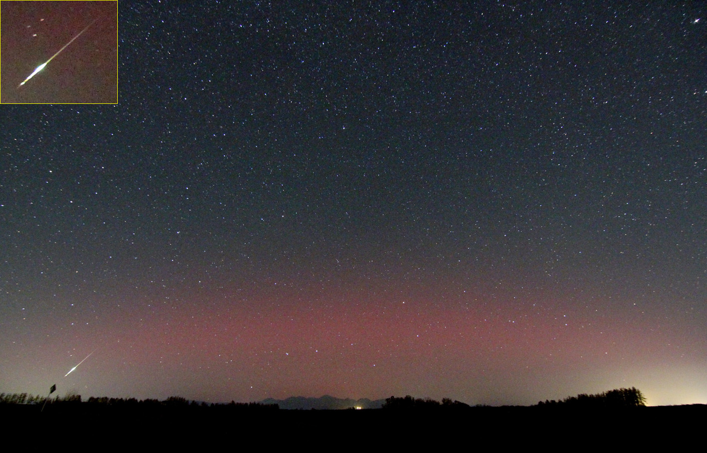 1分インターバルで撮影していたもので、偶然火球クラスの流星が写りました。 時刻、形態等から同種の構図で投稿された流星と同時流星と思われます。撮影時刻は正確ではありません(数10秒の狂いあり)。 肉眼ではオーロラは見えず、このあたりの透明度が何となく悪いように感じました。色調も判別できませんでした。