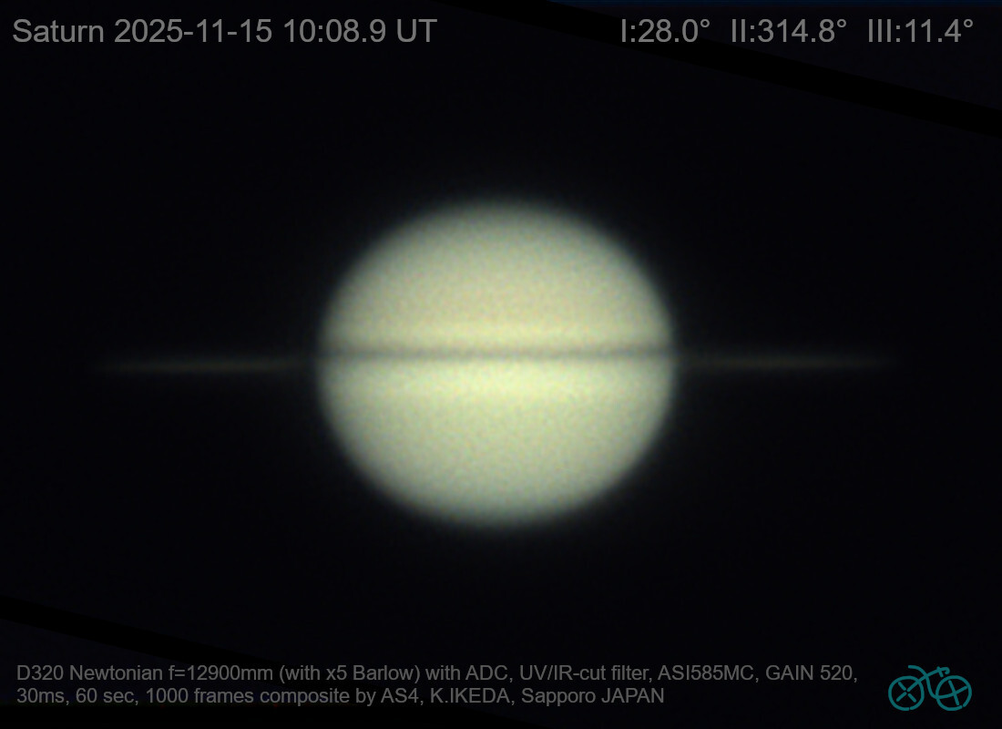 札幌はなかなか晴れません。今日こそと思いましたが、シーイングが暴れて、ほとんど絵にならず、雲に覆われてしまいました。なんとか撮った中の比較的良かった1ショットです。環は眼視では普通に見えましたが、カメラ+モニタだと環が見えないくらい暗く、12bitで撮影しました。 環が最細の時に最良のシーイングに出会いたいですね。その前に晴れてくれないと話になりませんが..
