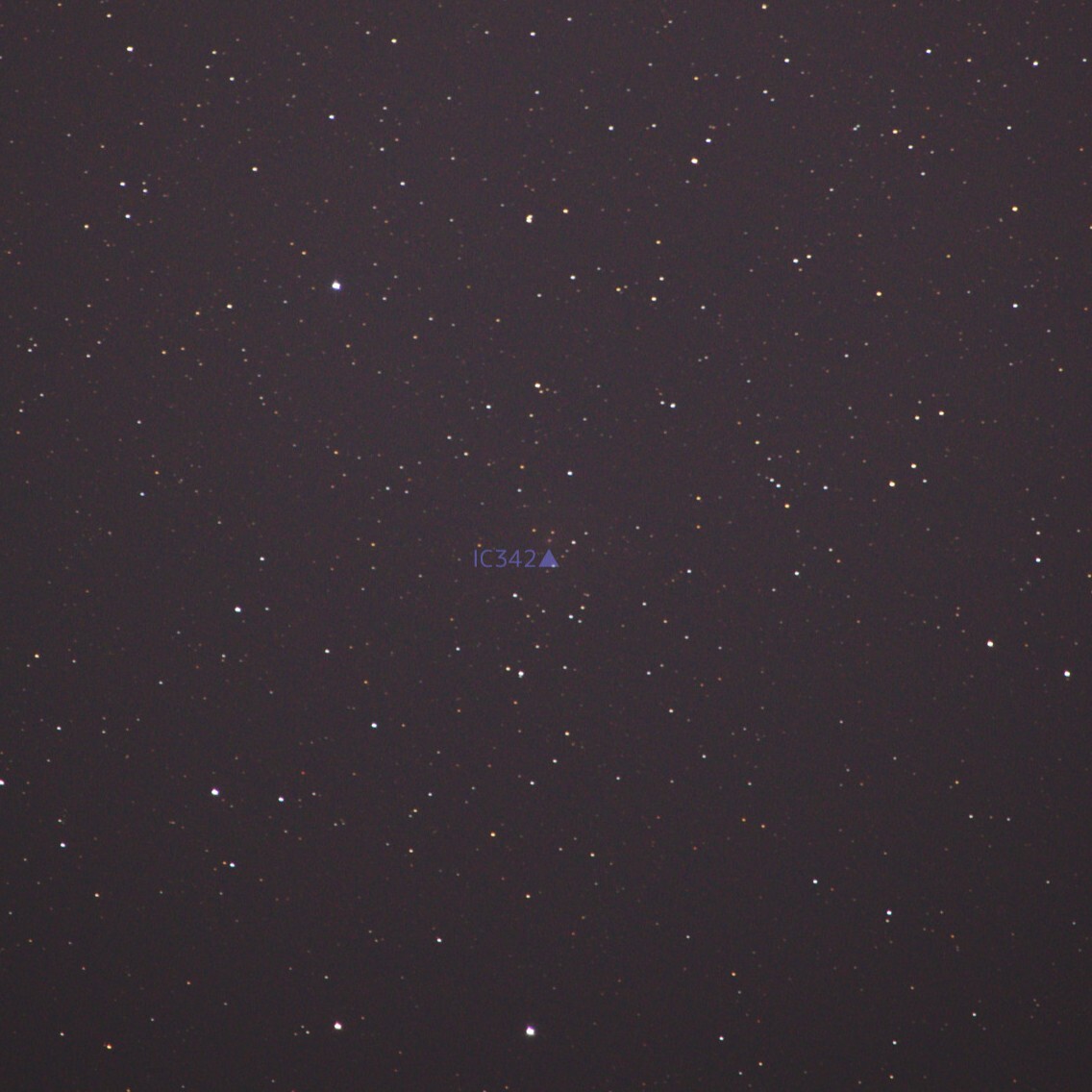 天体写真で人気のこちらの銀河ですが、周囲の渦巻部分は大きいがとても淡いので、この露出では明るい中心部のみが恒星状に写りました。 天の川の近くに見える珍しい銀河ですが、天の川の星間物質が光を弱めているためだそうです。