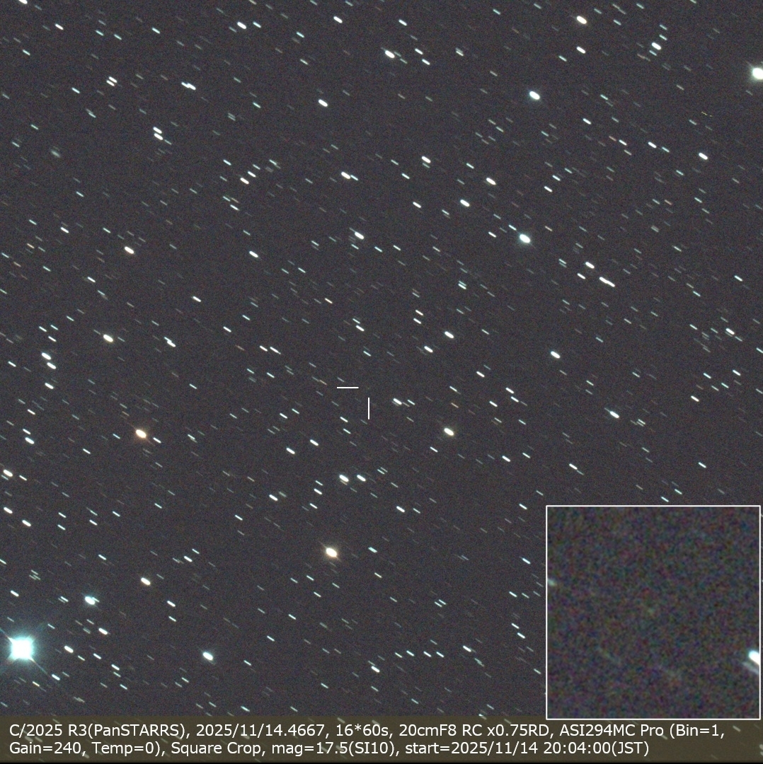 C/2025 R3(PanSTARRS), 2025/11/14.4667, 16*60s, 20cmF8 RC x0.75RD, ASI294MC Pro (Bin=1, Gain=240, Temp=0), Square Crop, mag=17.5(SI10)