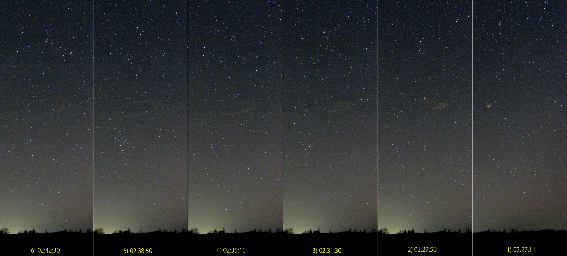 流星は02:23:29に出現(ATOM Cam2による)、流星痕を見つけてから撮影開始。 目視では1分程度しか確認できなかったが、画像では拡散しながら北方(右から左)へ移動する様子が捉えられました。