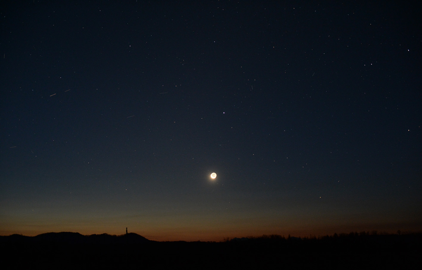 薄明の中、月齢27の月が昇ってきました。空の明るさに影響は与えませんでした。 流星観望も撤収にかかります。