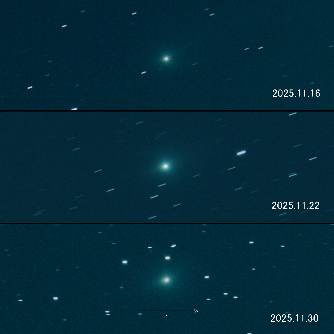 2025.11.16 → 9等級後半 2025.11.22 → 9等級前半 2025.11.30 → 9等級前半 2025年10月29日が近日点でしたが 地球に近づいているためか明るさを維持しているイメージです。