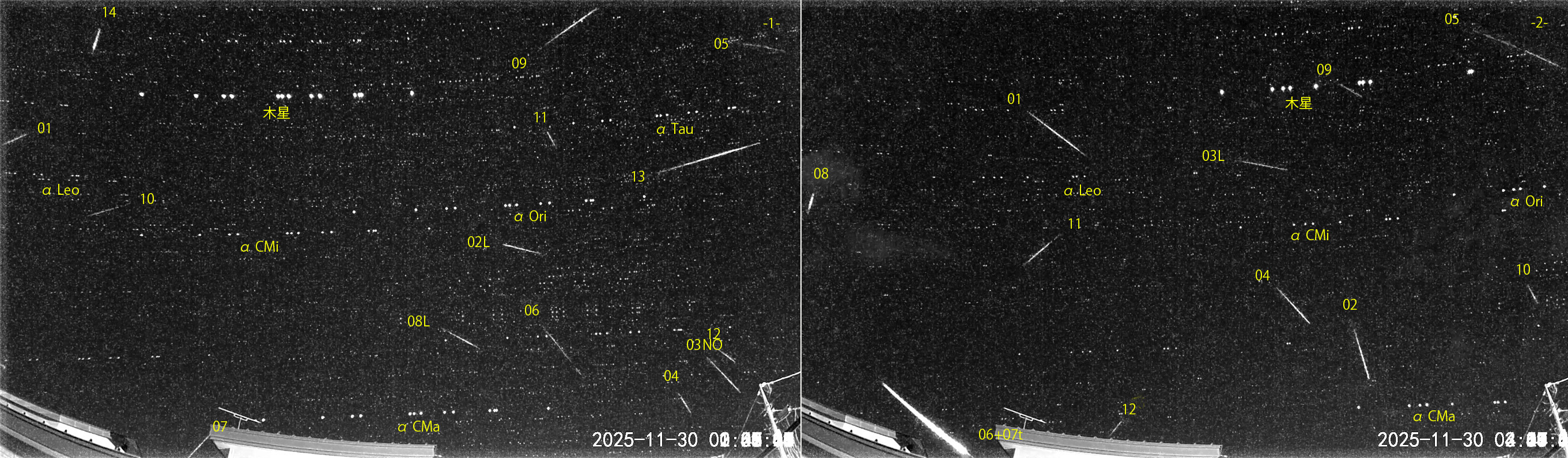 1) 00:08から約2.5時間の14コマと、2) 03:04から約2時間の12コマを処理しました。04時以降は曇りがちでした。 出現した順に数字と記号を始点付近に記入。tは痕traceあり。NT:おうし座北流星群、L:しし座流星群、NO:11月オリオン座流星群
