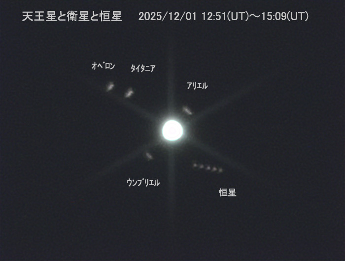 5本の動画を処理して出来た静止画を比較明合成してみました。衛星ミランダは暗くて写りませんでした。