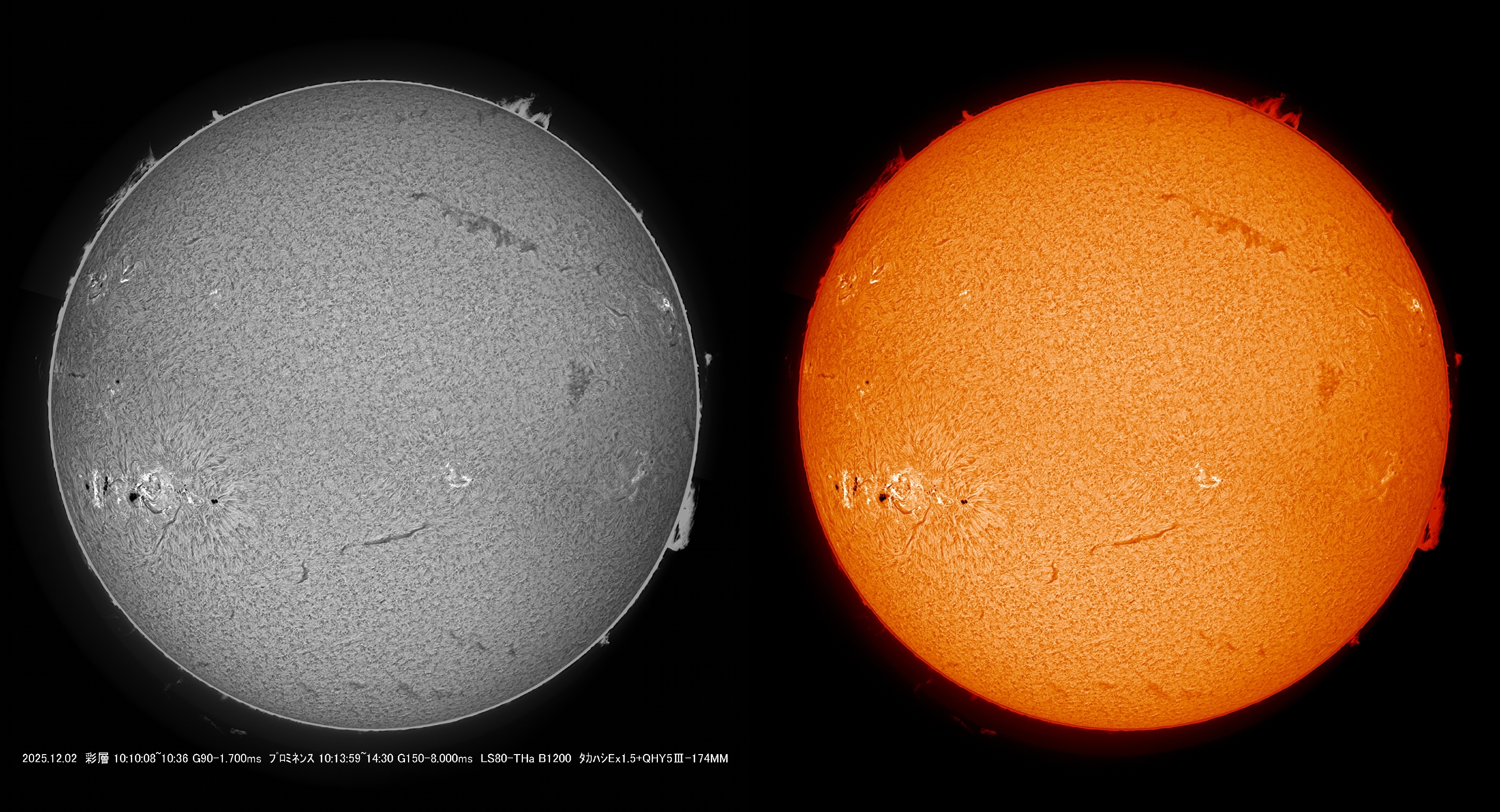 10/17以来久し振りの撮影、光球面とプロミネンスを2分割で個別に撮影して4画像を合成。分割画像の調整が上手くいかず合成部の明暗差が目立っていしまいました。