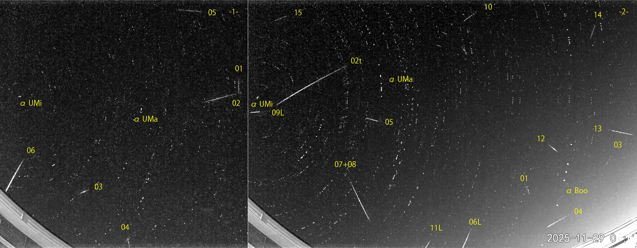 1) 00:24から約2時間の6コマと、2) 03:01から約2時間の15コマを処理しました。夜半前から快晴でした。 出現した順に数字と記号を始点付近に記入。tは痕traceあり。NT:おうし座北流星群、L:しし座流星群、NO:11月オリオン座流星群 しし座群末期の活動が見られます。
