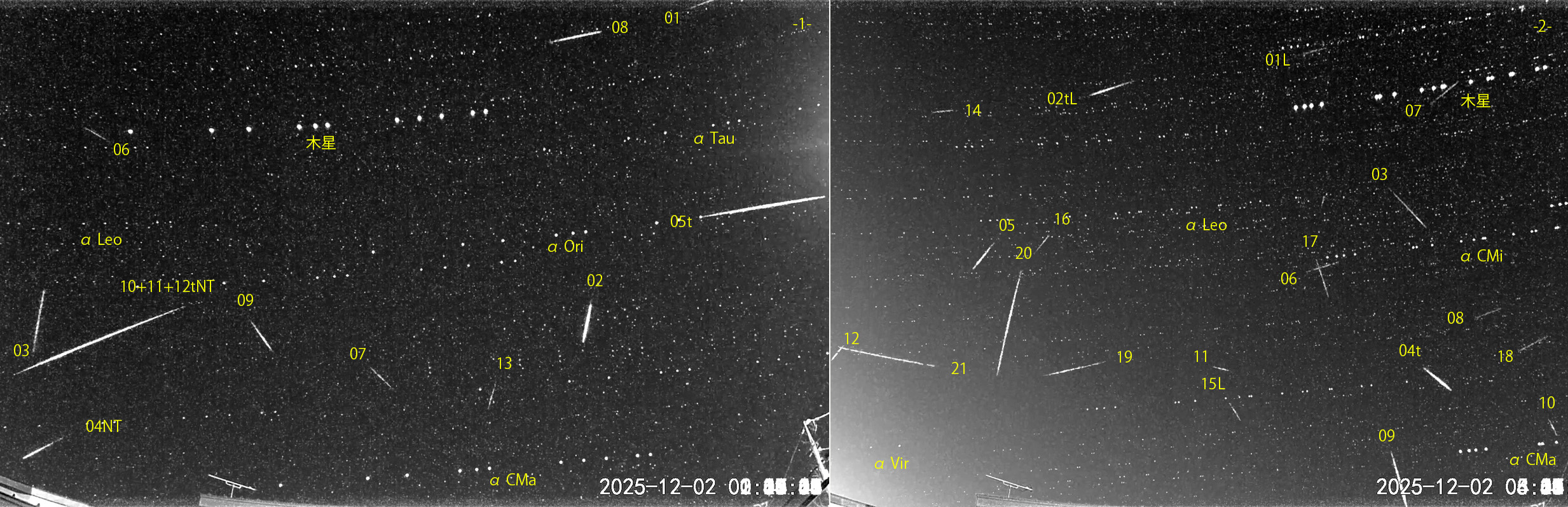 1) 00:10から約2.5時間の13コマと、2) 03:08から約2.5時間の21コマを処理しました。快晴が続きました。 出現した順に数字と記号を始点付近に記入。tは痕traceあり。NT:おうし座北流星群、L:しし座流星群、NO:11月オリオン座流星群 散在流星が多く、しし座群末期の活動も見られます。
