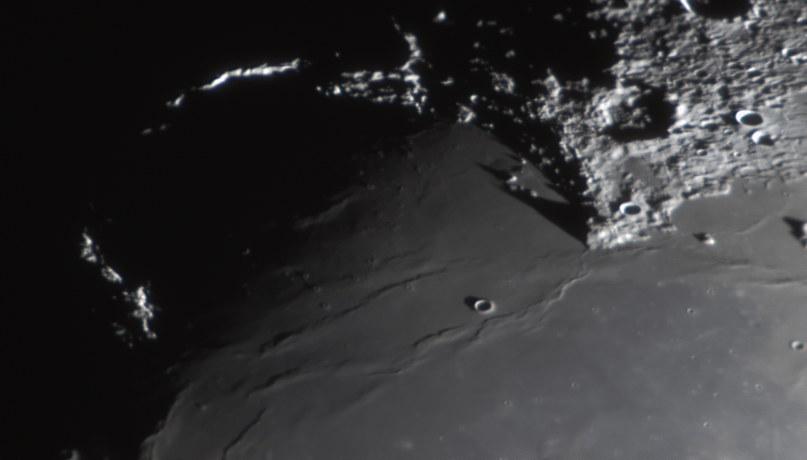 リッジの波が入江に押し寄せていて小さなクレーターも沢山あり、入江は穏やかではないようです。