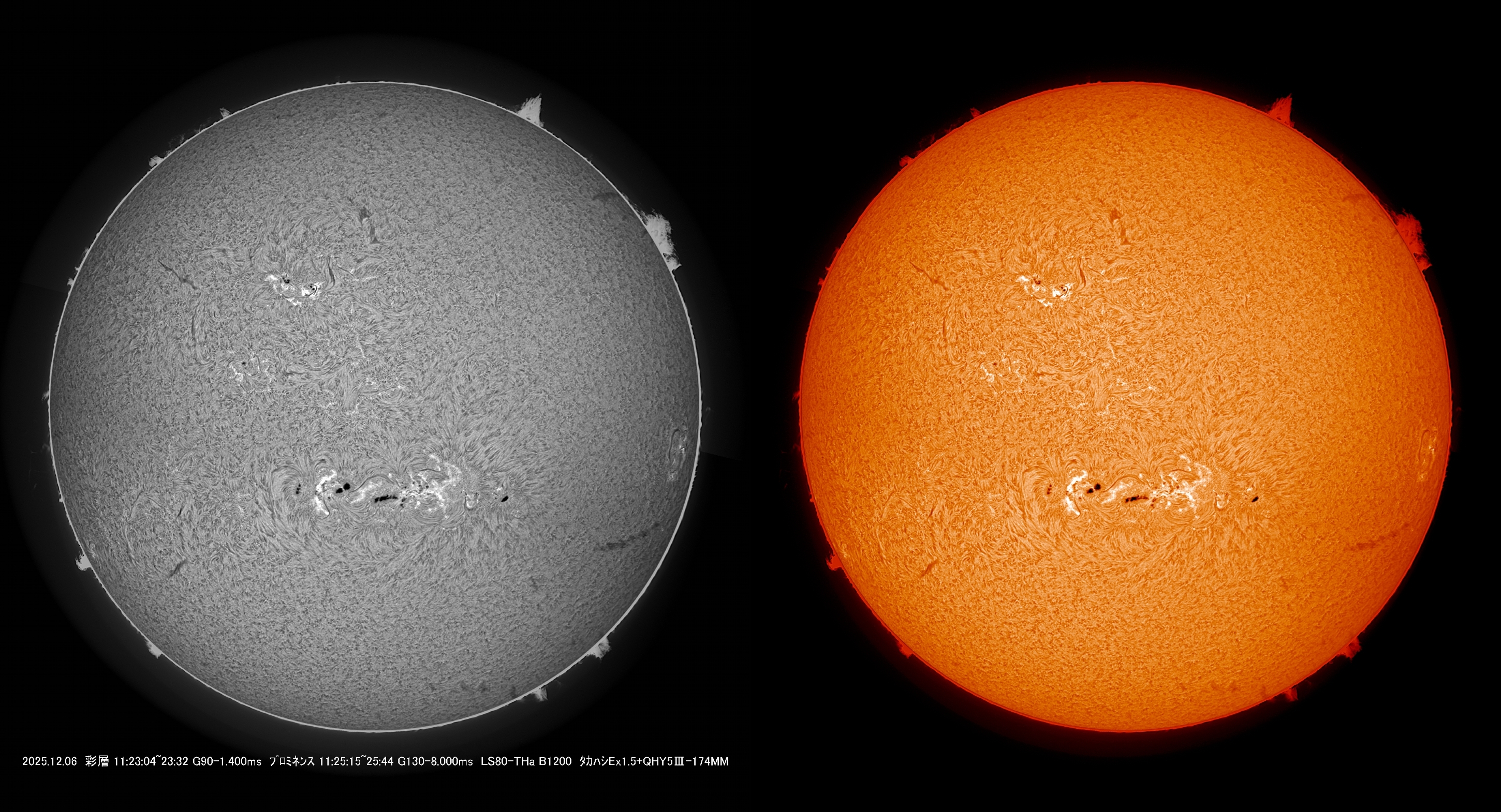 光球面とプロミネンスを2分割で個別に撮影して4画像を合成。快晴の予報でしたが早朝から暑い雲に覆われ11時過ぎた頃から雲間ができ撮影ができました。