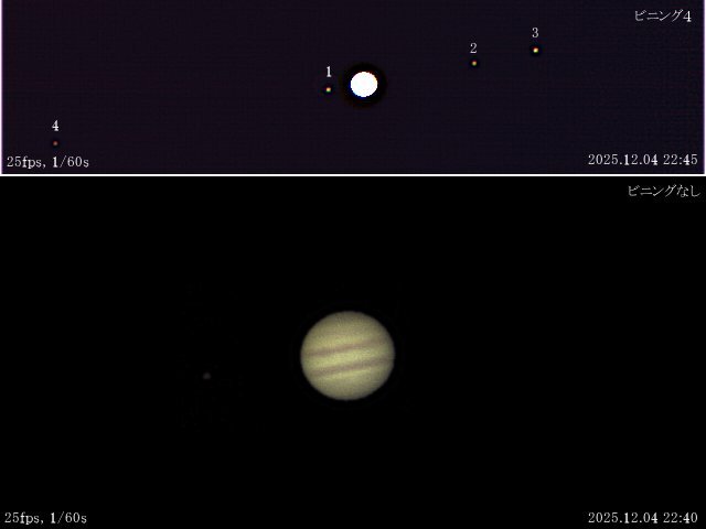 画像に示した条件で撮影した動画から、ビニングなし、ビニング4でそれぞれスタック処理に1589枚、1011枚を使ったので、露出に換算するとそれぞれ26.5秒、16.9秒となります。