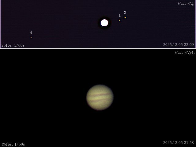 画像に示した条件で撮影した動画から、ビニングなし、ビニング4でそれぞれスタック処理に751枚、748枚を使ったので、露出に換算するとそれぞれ12.5秒、12.5秒となります。