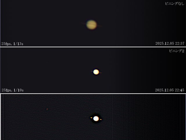 画像に示した条件で撮影した動画から、ビニングなし、ビニング2でそれぞれスタック処理に833枚、519枚を使ったので、露出に換算するとそれぞれ33.3秒、20.8秒となります。