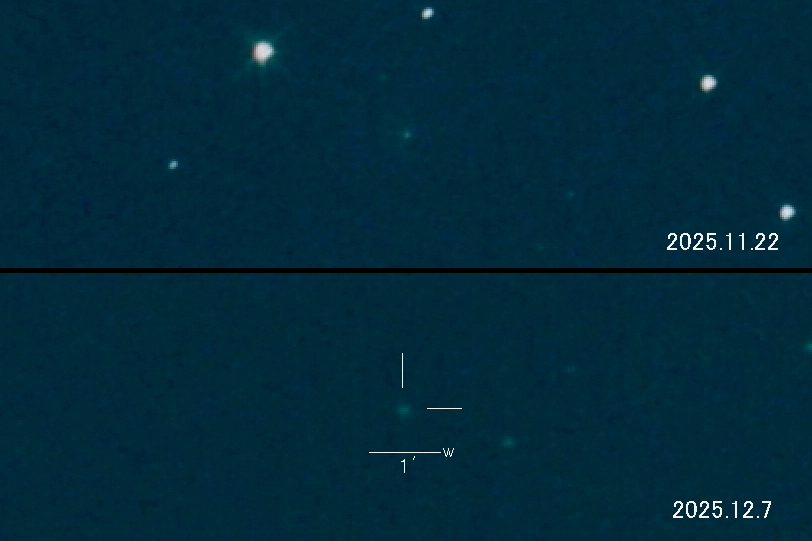 2025.11.22 → 16等級前半 2025.12.7 → 15等級前半 12月5日頃にバーストしたそうです。 集光が弱いので小規模なバーストかも知れません。 まだ高度が低い(20度)位置で撮影したので星像がボケたイメージです。 もっと高度が高くて暗夜ならさらに明るく写ったものと思われます。