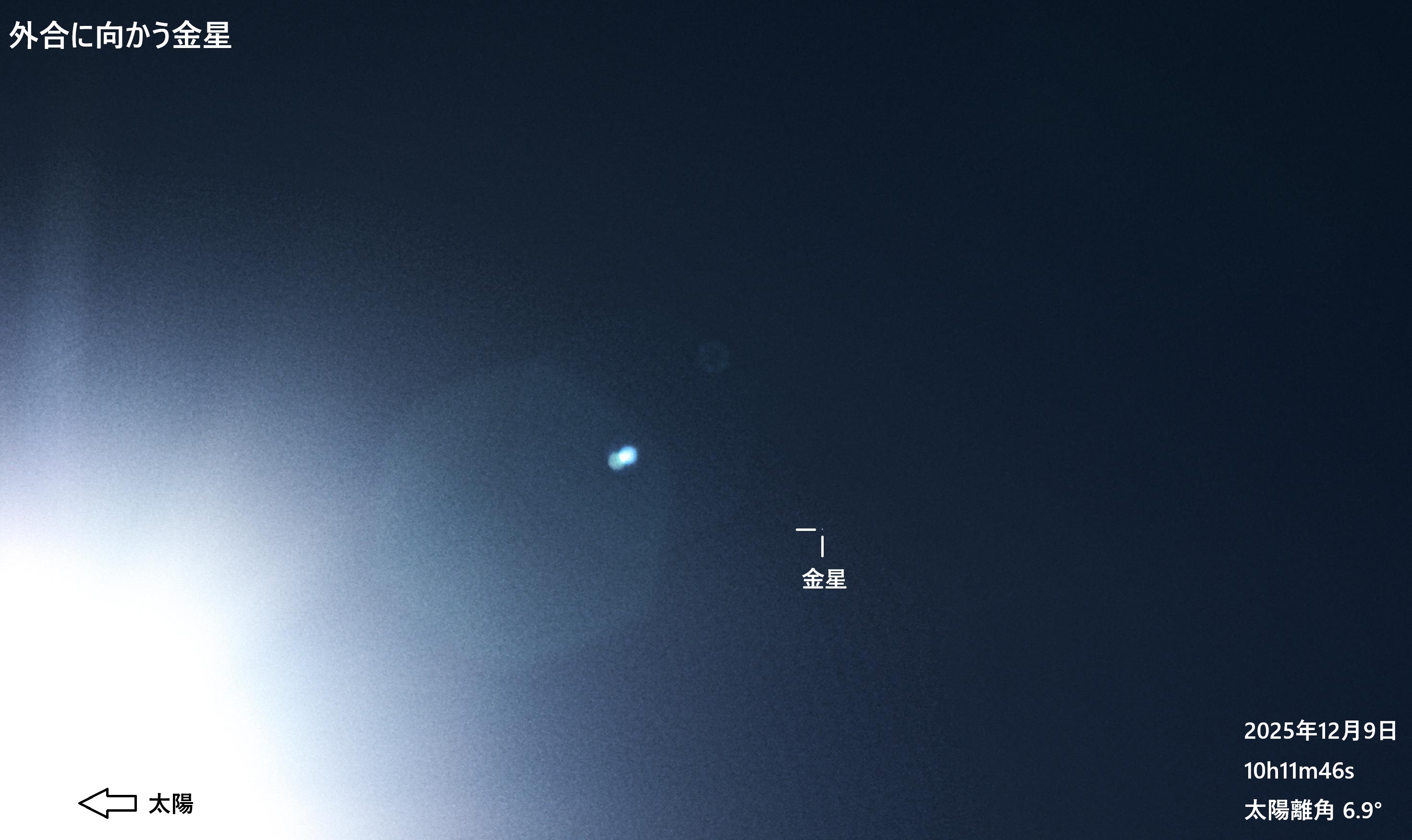 シーイング:不明 透明度:3.5~4/5 太陽離角 6.9° 突然の晴れと短時間の透明度の良さに恵まれました。外合まで1か月を切り、太陽離角も6°台に入ってきました。これもう今年にあった内合の太陽離角より近くに来てるんですね。