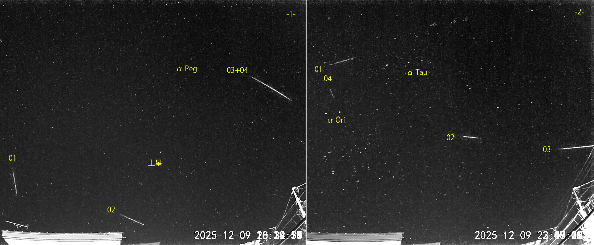 1) 18:22から約2時間の4コマを、2) 22:47から約1時間の4コマを処理しました。快晴が続きました。 出現した順に数字と記号を始点付近に記入。tは痕traceあり。 【流星群記号】NT:おうし座北流星群、G:ふたご座流星群、M:いっかくじゅう座流星群