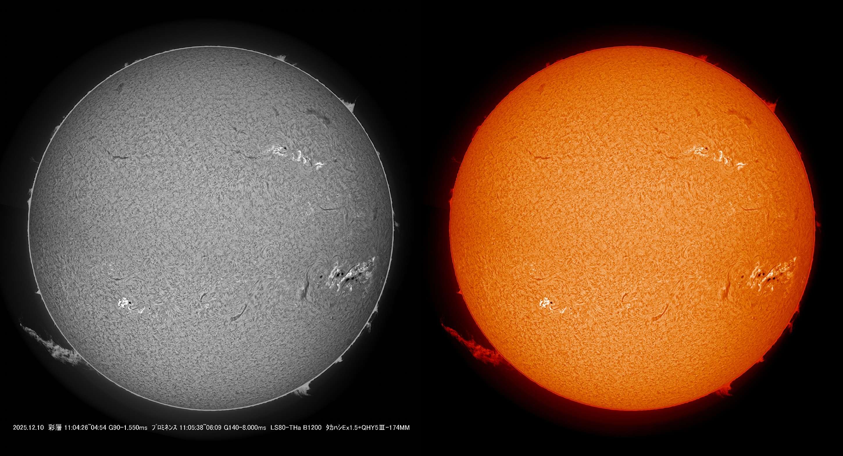 光球面とプロミネンスを2分割で個別に撮影して4画像を合成・擬似カラー化。今日は太陽の周囲に雲が多く何度も撮り直し・・・疲れました。