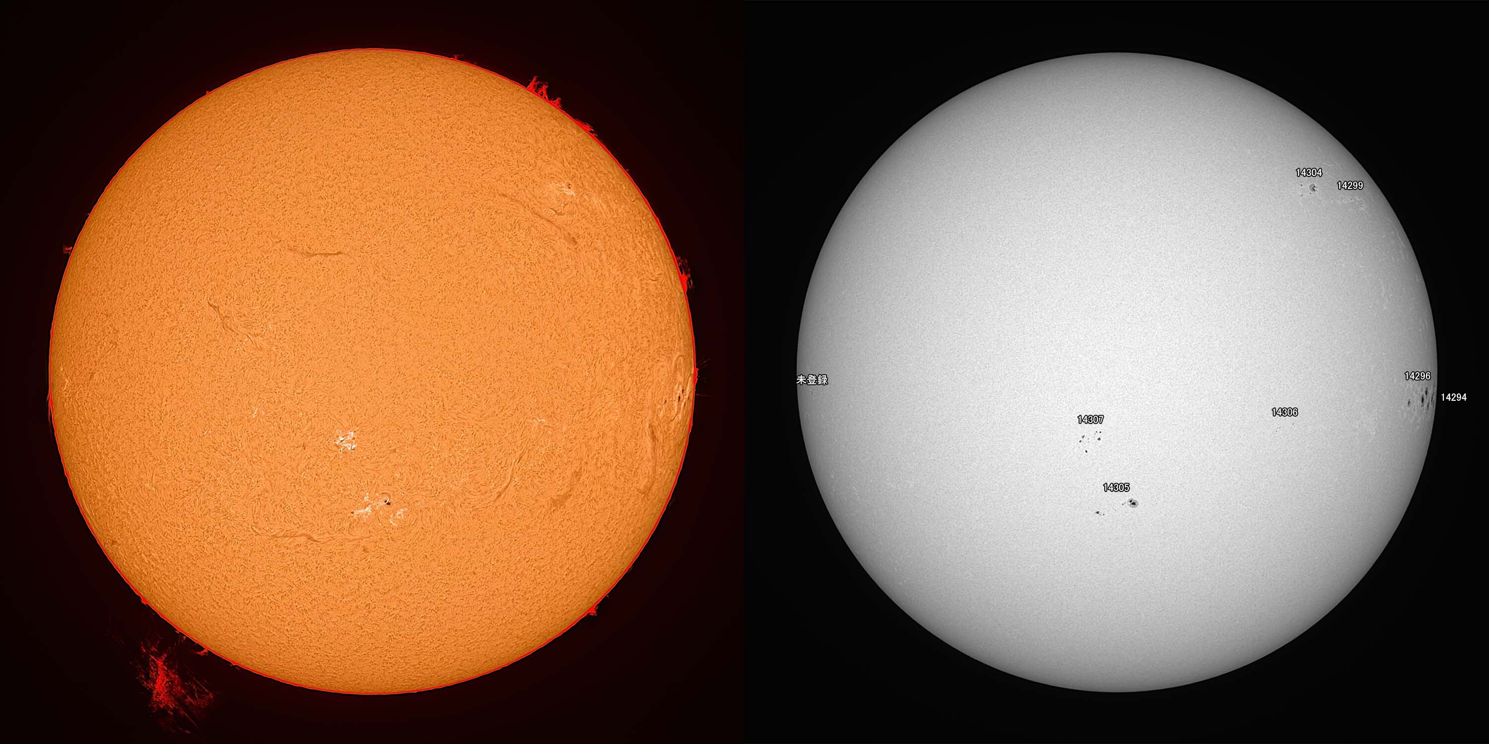光球面:FireCapture、ROI 3600x2400、Gain 100、1.7msec x1000、撮影時間 31秒/プロミネンス:FireCapture、ROI 3600x2400、Gain 300、1.7msec x1000、撮影時間 31秒
