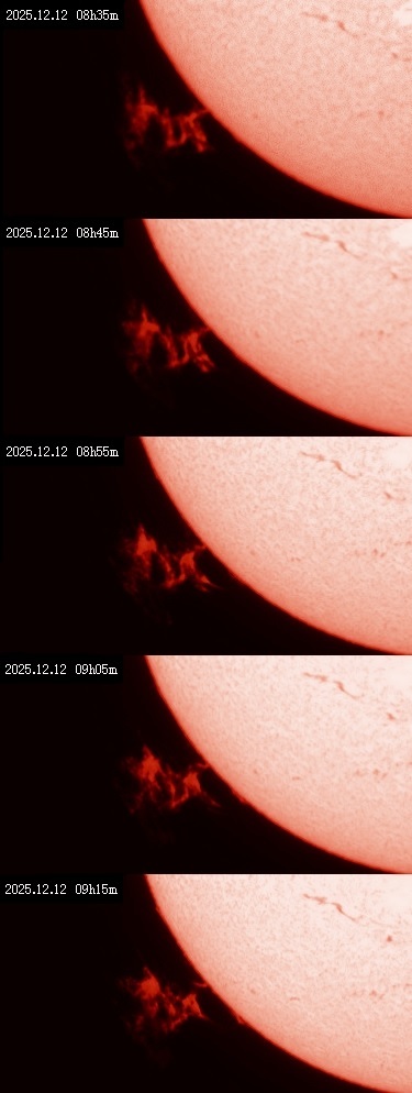 上(08:35)から10分ごとに下(09:15)まで連続撮影し、プロミネンスの部分のみを貼り合わせてみました。 高度が低く強風でシーイングがかなり悪かったので、参考程度とお考えいただければと思います。