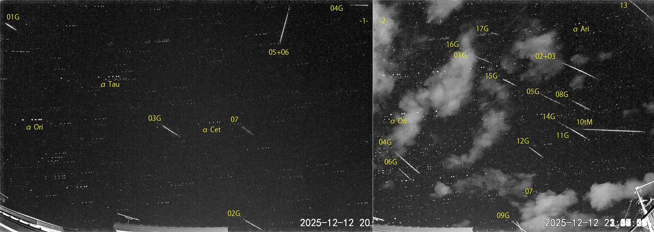 1) 20:01から約1時間の7コマを、2) 21:19から約2時間の17コマを処理しました。22時台に流れ雲あり。 出現した順に数字と記号を始点付近に記入。tは痕traceあり。 【流星群記号】G:ふたご座流星群、Mo:いっかくじゅう座流星群、Hy:うみへび座流星群、Co:かみのけ座流星群 後半にふたご座群が活発になりました。
