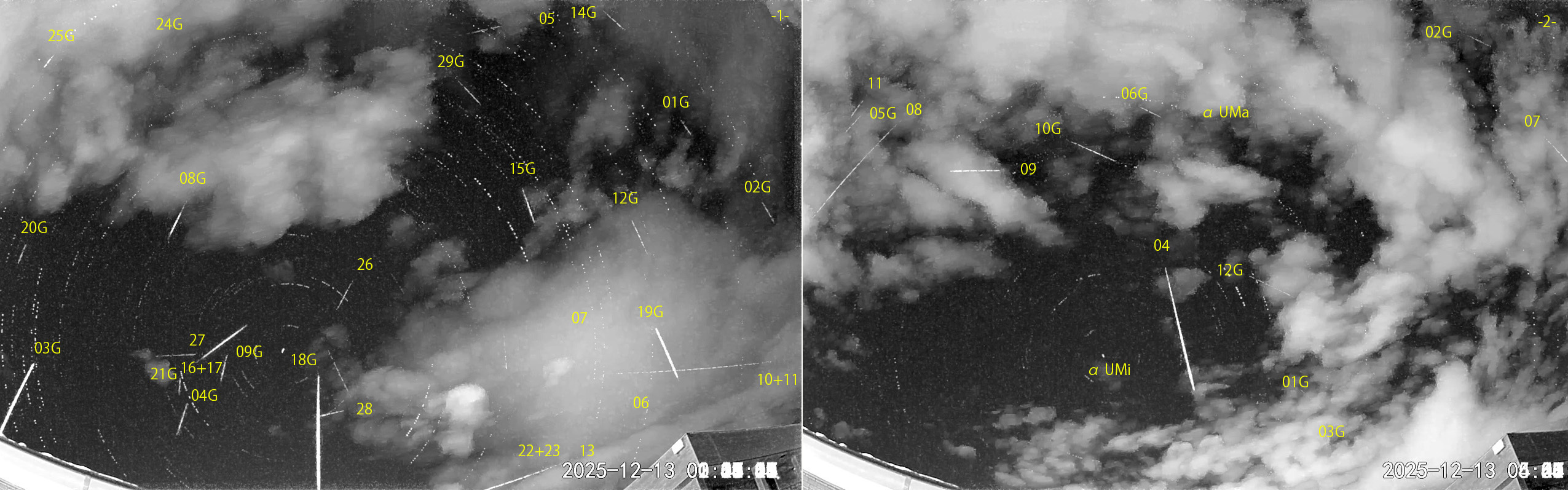 1) 00:53から約2時間の29コマを、2) 04:34から約1時間の12コマを処理しました。03時台-04時台前半は雲が多く、合成から除外。 出現した順に数字と記号を始点付近に記入。tは痕traceあり。 【流星群記号】G:ふたご座流星群、Mo:いっかくじゅう座流星群、Hy:うみへび座流星群、Co:かみのけ座流星群