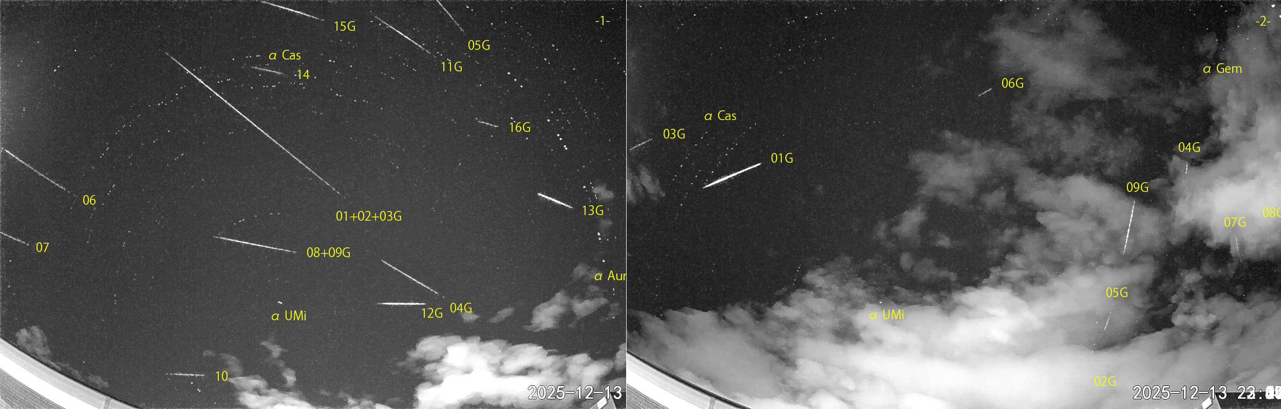 1) 18:19から約2時間の16コマを、2) 22:40から約1時間の9コマを処理しました。22時台前半は雲が多く、6コマを合成から除外。 出現した順に数字と記号を始点付近に記入。tは痕traceあり。 【流星群記号】G:ふたご座流星群、Mo:いっかくじゅう座流星群、Hy:うみへび座流星群、Co:かみのけ座流星群 北天では、比較的長経路の流星が多くなりました。
