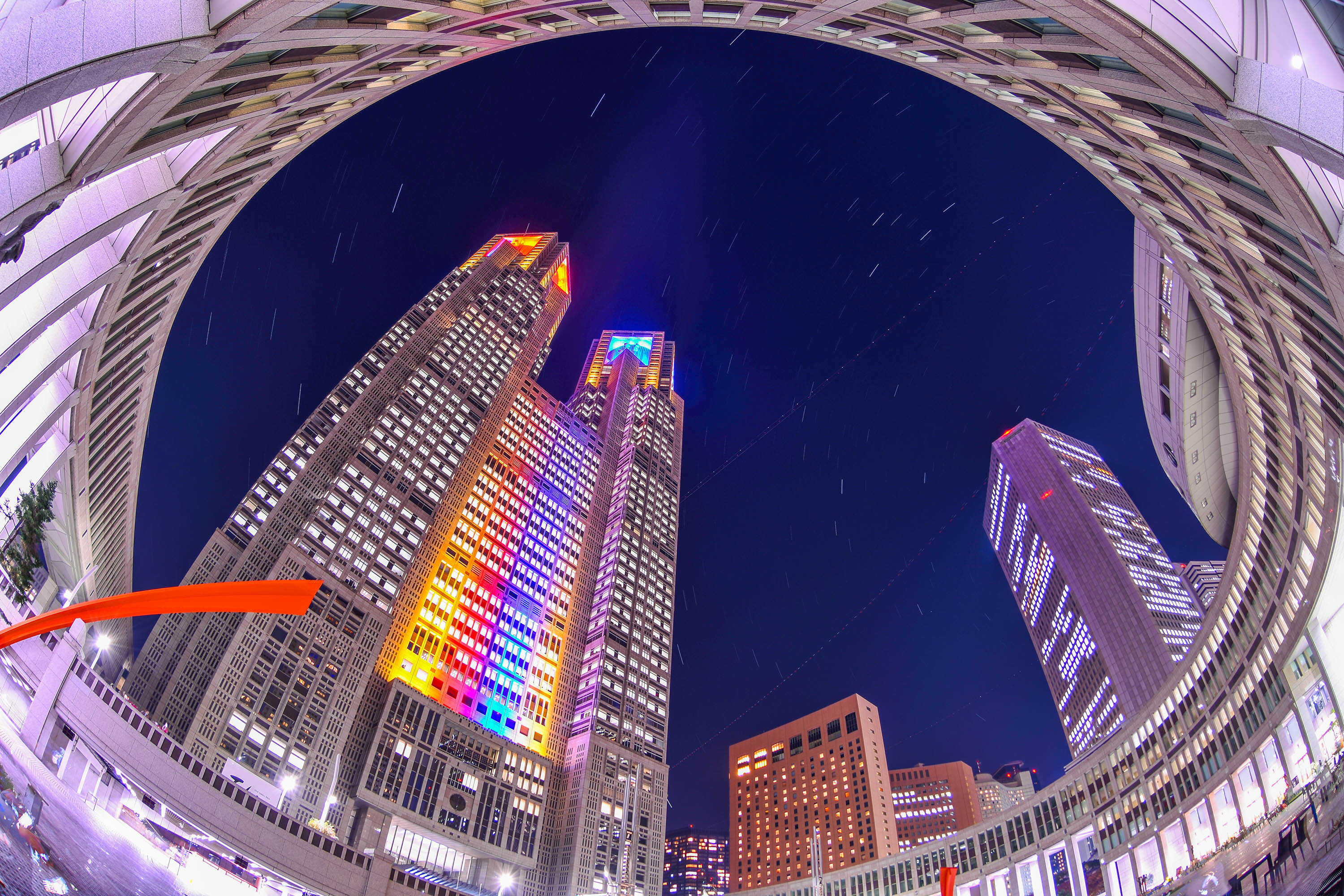 佐藤 純哉東京都庁「いい夫婦の日」ライトアップと星空 魚眼レンズ使用