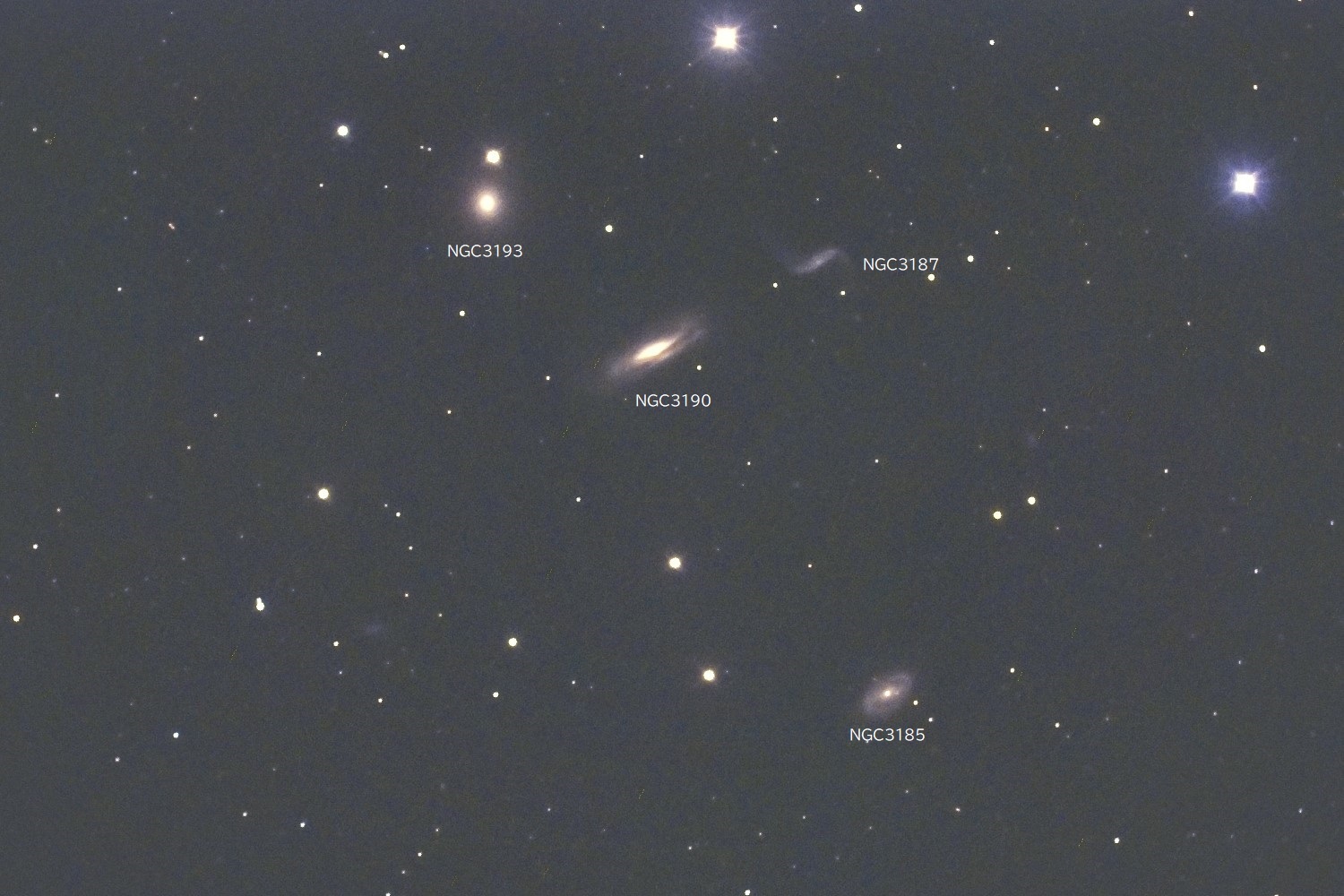 「しし座」頭部のγ星(ガンマ)とζ星(ゼータ)の間にある特異銀河団です。 明るさはNGC3193~3185の順に11.02等、11.05等、13.28等、12.20等(いずれもⅤ等級)です。 3Iを撮った後、24Pが樹木から顔を出すまでの間に撮影してみました。