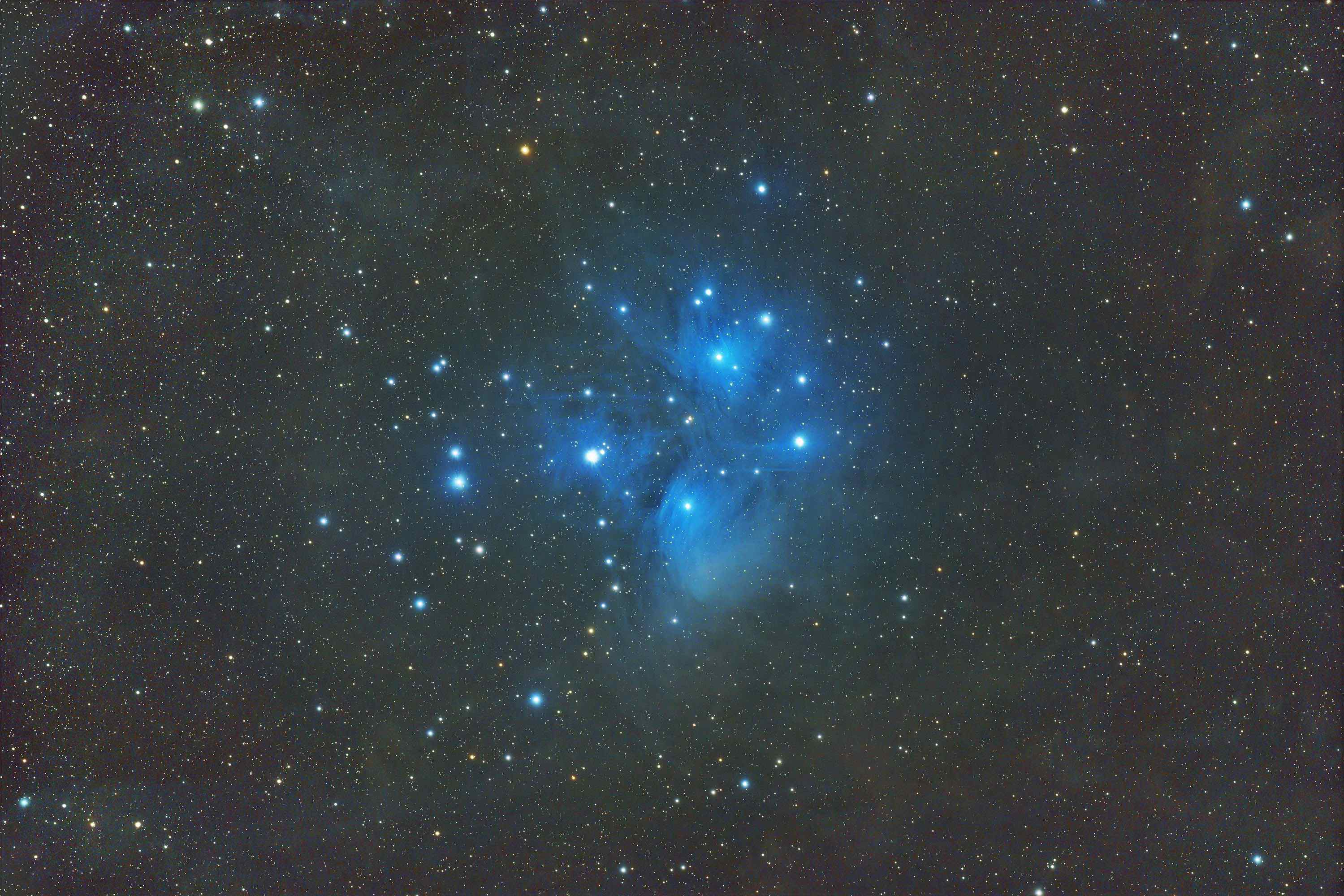 当日は日中よく晴れていたものの薄明終了ごろから雲に覆われてしまいました。 その後、夜半過ぎにようやく晴れたので、西に傾いたプレアデス星団を撮影しました。 冷却CMOSカメラで撮影した画像をPixInsightで画像処理すると星団周辺の淡い分子雲も比較的容易に写すことができます。