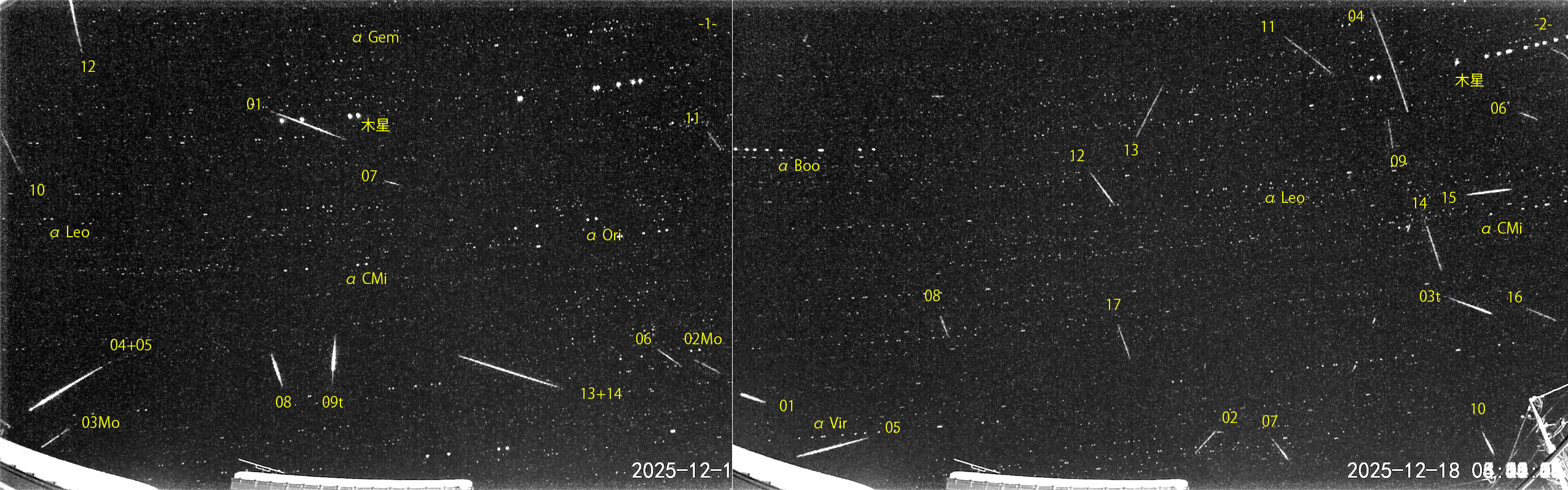 1) 00:02から約3時間の14コマを、2) 03:01から約2時間の17コマを処理しました。 出現した順に数字と記号を始点付近に記入。tは痕traceあり。 【流星群記号】G:ふたご座流星群、Mo:いっかくじゅう座流星群、Hy:うみへび座流星群、Co:かみのけ座流星群 快晴に恵まれましたが、朝の最低気温はマイナス15℃。カメラは元気でしたが、三脚が霜で白くなりました。