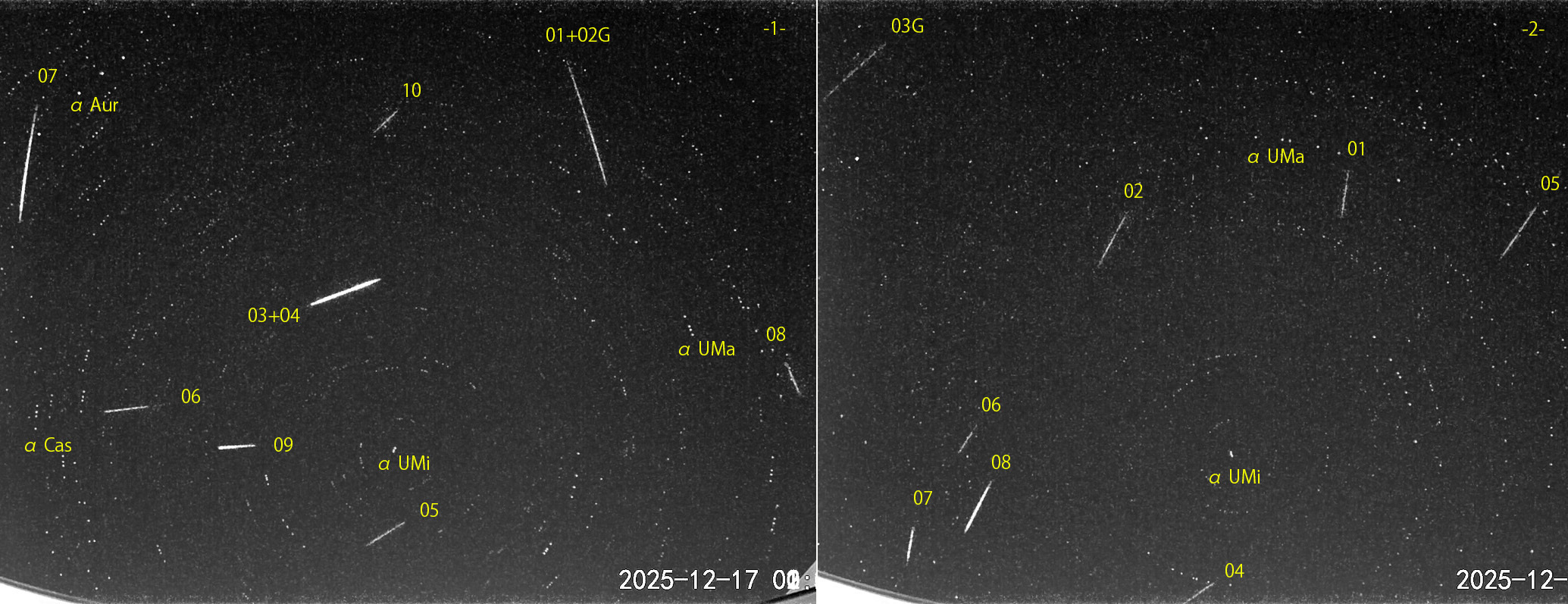 1) 00:02から約2時間の10コマを、2) 02:36から約2時間の8コマを処理しました。 出現した順に数字と記号を始点付近に記入。tは痕traceあり。 【流星群記号】G:ふたご座流星群、Mo:いっかくじゅう座流星群、Hy:うみへび座流星群、Co:かみのけ座流星群