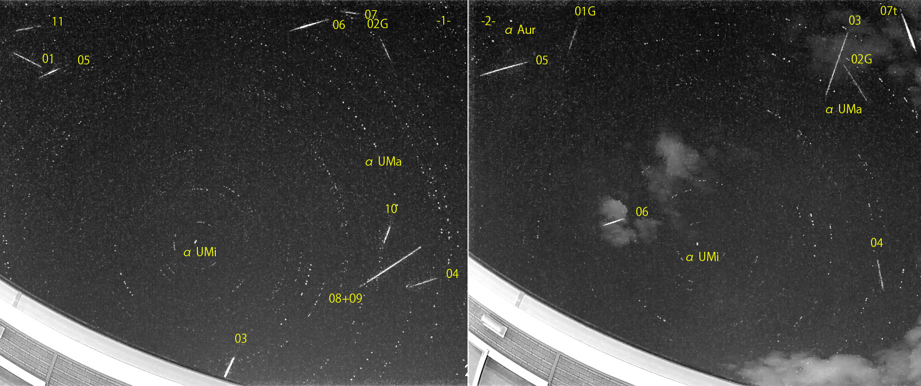 1) 00:35から約2.5時間の11コマを、2) 03:12から約1.5時間の7コマを処理しました。 出現した順に数字と記号を始点付近に記入。tは痕traceあり。 【流星群記号】G:ふたご座流星群、Mo:いっかくじゅう座流星群、Hy:うみへび座流星群、Co:かみのけ座流星群